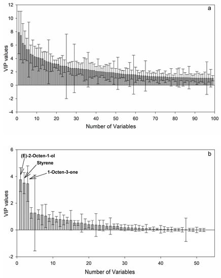Identified volatile compounds and extract ion chromatogram (EIC) data generated by XCMS were both subjected to chemometrics analysis by OPLS-DA to compare MVOCs profiles, by means of SIMCA-P™ software (Version 13.0, UMetrics AB, Umeå, Sweden). Before constructing the OPLS-DA model, data were normalized using a Pareto scaling strategy to reduce the impact of artifacts and noise in the models, which is positive for the model’s predictive ability []. For evaluation of the model performance, two parameters were calculated, namely the R2 representing total explained variance and cumulative Q2 that represents the fraction of the variation of Y which can be predicted by the cross validation model []. Potential biomarkers were chosen from VIP generated from the OPLS-DA model. This variable selection method was described by Chong and Jun []. The higher the absolute value of VIP, the more important the corresponding variable []. Furthermore, potential markers identified by VIP were screened out by t-test (p-values below 0.05).