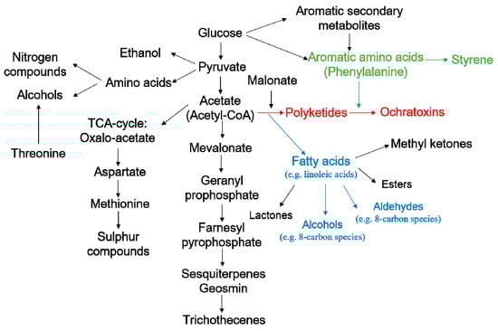 The result was similar to previous studies, that the non-toxigenic strains synthesized more volatile compounds than the toxigenic strains []. The reason for abundant C8-compounds, (E)-2-octen-1-ol, octanal and 1-octen-3-one, in MT strains may be explained by the metabolic pathway leading to the formation of MVOCs and OTA, which provides important clues to the relationship between mycotoxin formation and various groups of volatiles (Figure 6) []. The polyketide skeleton formation (marked in red) is a critical step of OTA biosynthesis, which requires acetate and malonate with the activity of polyketide synthases []. Meanwhile, the fatty acid formation pathway (marked in blue) is also derived from acetate and malonate via the acetate-malonate pathway, which forms a competitive relationship with polyketide skeleton formation []. According to that, we speculate that less OTA biosynthesis may lead to more fatty acid formation. As a result, more eight carbon compounds, octanal, (E)-2-octen-1-ol and 1-octen-3-one, are synthesized from fatty acid []. In particular, 1-octen-3-one was a possible precursor of 1-octen-3-ol being produced via reduction or autoxidation [,]. Regarding the hydrocarbons, styrene was identified as the important metabolite for the MT strains and the result was in agreement with a previous study []. From the pathway marked in green (Figure 6), it can be assumed that less phenylalanine was used to produce the ochratoxins, and the surplus was used to synthesize more styrene than the HT strains. Limonene was firstly selected as a potential marker for MT strains, though the reason for this is not clear and needs to further research.