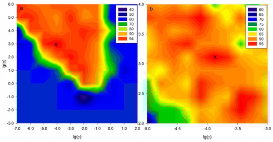 Grid search for optimizing parameters (C, γ). (a) Coarse search and (b) finder search. The optimal parameters selected by grid search are marked as “×”.
