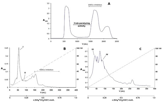 (A) Gel filtration profile of P. crucifer aqueous extract. The soluble material contained in 5 grams of whole-body homogenate (350 mg/90 mL) was fractionated on Sephadex G-50 (5 × 93 cm) at 2 mL/min using 0.1 mol/L ammonium acetate. Fractions of 20 mL each were collected; those within the elution volumes of 820 mL to 1460 mL were paralyzing to all of the crabs, and were pooled; (B) Cation-exchange chromatographic profile of the crab-paralyzing pool of chromatographic fractions from Sephadex G-50, in Fractogel EMD SO3− 650 M (1.8 × 5 cm); (C) Anion-exchange chromatographic profile of the non-retained fraction from the cation exchanger, in Fractogel EMD DEAE 650 M (1.8 × 5 cm). Both separations (B,C) were done at a flow rate of 1 mL/min using a 400-mL gradient, from 0.01 mol/L to 1 mol/L ammonium acetate. Eighty fractions of 5 mL each were collected in every chromatographic separation. Dashed lines in the ion-exchange chromatographic profiles represent the gradient of ammonium acetate. Fractions exhibiting toxicity to crabs were named I, II, III, and IV. The pools of fractions that inhibited acid-sensing ion channels are shown in both gel-filtration and cation-exchange chromatographic profiles, according to previous results with the same P. crucifer homogenate, using identical conditions []. PhcrTx1, an acid-sensing ion channel toxin from P. crucifer [], eluted inhibiting pools of chromatographic fractions in the ASICs, as shown in (A,B). As shown, the crab-paralyzing zone and the ASICs inhibition zone barely overlapped in the gel filtration profile (A); and completely separated from each other in the cation-exchange profile (B). PhcrTx1 is not present among the crab-paralyzing chromatographic fractions isolated from the ion-exchange chromatographic separations.