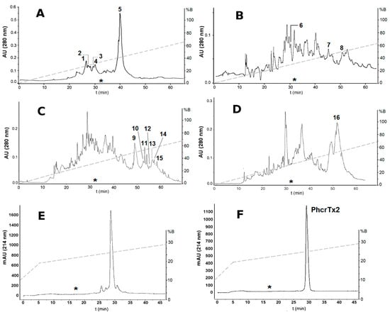 Reversed-phase chromatographic profiles of crab-paralyzing fractions from ion-exchange chromatography. (A,B) Reversed-phase chromatographic profiles of fractions I and II previously separated from cation-exchange chromatography, respectively; (C,D) Reversed-phase chromatographic profiles of fractions III and IV previously separated from anion-exchange chromatography, respectively. Conditions: Hypersil H5 ODS column (4.6 × 250 mm), flow rate 0.8 mL/min, linear gradient from 0 to 80% B in 80 min. Chromatographic fractions showing toxicity to crabs are indicated in the figure (1 to 16); (E,F) Reversed-phase chromatographic purification of fraction number 5. Conditions: Discovery RPC18 HPLC column (4.6 × 250 mm), flow rate of 1 mL/min, gradient from 10 to 20% B in 5 min, followed by 20 to 30% in 50 min. The pure toxin was named PhcrTx2. The dashed line in every chromatographic profile represents the gradient of acetonitrile. The asterisk (*) in (A–F) represent the point where PhcrTx1 elutes in the same chromatographic conditions, according to previous results [].