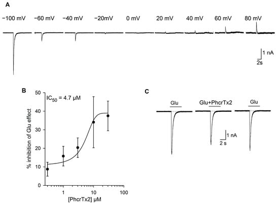 According to the present results, PhcrTx2 inhibited glutamate currents in snail neurons. However, no specific subtype of glutamate receptors was determined, and it will be of great interest to study the toxin’s specificity in the future using different models. Although the PhcrTx2 inhibitory activity on glutamate-gated currents exhibited low potency and efficacy, this study supports the idea of the existence of glutamate-gated ion channel toxins in these organisms, as previous studies have indicated through the evaluation of a semi-pure chromatographic fraction and a sea anemone crude extract [,]. Thus, our results represent a step forward toward the finding of a glutamate-gated ion channel toxin in sea anemone. It would be interesting to test other structurally related toxins on glutamate-gated ion channels, especially Am-2 [], which shares high sequence similarity with PhcrTx2 and might have common targets.