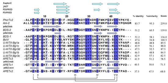 The theoretical isoelectric point of PhcrTx2 is 7.61, indicating that it is a slightly basic peptide. PSI-BLAST results showed significant sequence similarity to several sea anemone toxins already annotated in non-redundant NCBI (nrNCBI) and UniProt/Swiss-Prot databases: (a) Am II (83.7% identity), a crab-paralyzing toxin from Antheopsis maculata []; and (b) BDS-I and BDS-II (both, 51.2% identity), which are antiviral and antihypertensive toxins that inhibit Kv3 channels, and delay the inactivation of Nav channels [,,], which were isolated from Anemonia viridis. These toxins are classified within the “Defensin 4” protein family (Pfam accession: PF07936), to which PhcrTx2 is closely related, according to the search against the Pfam database []. PF07936 is composed of sea anemone neurotoxins BDS-I, BDS-II, APETx1 [,], and APETx2 [,], which are defensin-like folded peptides, and representative members with three-dimensional (3D) structures determined by NMR. Figure 5 shows a multiple sequence alignment of PhcrTx2 and the PF07936 members of highest similarity, according to the EMBOSS Water tool. The multiple sequence alignment indicated that PhcrTx2 has the disulfide bonding pattern Cys4-Cys40, Cys6-Cys32, and Cys22-Cys41. The toxin fits very well into the features described for β-defensins [] such as (1) composed of 35–50 amino acid residues; (2) contain six cysteine residues linked according to the connectivity I-V, II-IV, III-VI; and (3) the last two cysteines are consecutively situated (in a CCXn pattern where n >1) near the C-terminus.