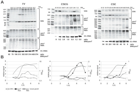 In summary, we can conclude that the amount of SR6 increased only in TY medium significantly towards stationary phase, whereas it was nearly constant in CSE. As, however, the amount of yonT RNA displayed a 4 or 5.5-fold increase in CSEG and CSE, respectively, the SR6/yonT ratio decreased in these media. But only in CSEG this ratio fell to about 1, so that only in this medium toxin expression might be expected.