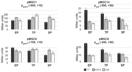 Activities of the yonT promoter and the sr6 promoter in TY (black), CSEG (grey) and CSE (white) medium over growth. B. subtilis strains generated by integration of the indicated vector fragments into the amyE locus of DB104 were grown in TY, CSEG or CSE medium. In early exponential phase (EP), late exponential phase/transition phase (TP) or stationary phase (SP) samples were withdrawn and used for β-galactosidase measurements. Averages of three independent measurements with standard deviations are shown. Vector pMG16 without a promoter insert yielded in all tested media values between 1 and 3 Miller units.