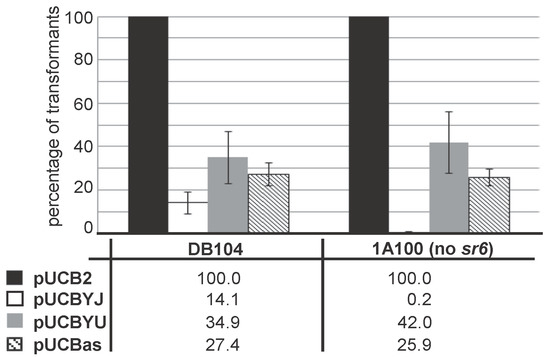As SR6 is not only complementary to the 3′ region of yonT mRNA, but also to the 5′ region including the RBS of yoyJ (see Figure 2A,C), it was previously hypothesized [20] that YoyJ might be also a toxin, and its expression inhibited by SR6. To investigate this issue, we constructed pUCBYJ, a multicopy E. coli/B. subtilis shuttle vector (≈50 copies/cell) that allows for overexpression of yoyJ in both E. coli and B. subtilis. Already upon transformation of E. coli we observed rather small transformant colonies that grew much slower than those of pUCBas used for overexpression of the complete sr6 gene. Therefore, we decided to compare the transformation efficiency of pUCBYJ in B. subtilis with that of pUCBas (encoding sr6) and pUCBYU encoding yonU that is not proposed to be a toxin. As control served the empty vector pUCB2. In parallel we used B. subtilis strain 1A100 lacking the prophage SPβ that does not encode yonT/yoyJ/sr6 and DB104 containing SPβ, and, thus, expressing the entire yonSTUV operon including sr6. As shown in Figure 5, the transformation efficiencies of pUCBas and pUCBYU were comparable in both strains, while the empty vector pUCB2 yielded about 5 times more colonies. By contrast, pUCBYJ could not be established in strain 1A100 that does not express the antitoxin SR6, whereas it yielded a few transformants in DB104. When we grew three DB104(pUCBYJ) transformants alongside three DB104(pUCBas) transformants, they did not display altered growth (not shown). Initially we suspected that they might have undergone mutations in the yoyJ gene, but sequencing of 10 clones demonstrated that this was not the case.