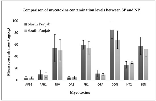 Figure 1 shows the mean contamination levels in the positive samples only (above the LOQ). The incidence rate of the mycotoxins was higher in North Punjab than in South Punjab. The levels of contamination of mycotoxins in both regions were not significantly different (p < 0.05). Overall, 78% of the samples were contaminated with either one or more mycotoxins, while 57% of the samples were contaminated with more than one mycotoxins. In 40% of the samples, AFB1 and AFB2 co-occurred. In 21% of the samples, the co-occurrence of the mycotoxins produced from Fusarium and Aspergillus moulds was observed. The co-occurrence of these specific toxins can be taken into account in the design of future toxicity studies to examine their impact on animal and human health.