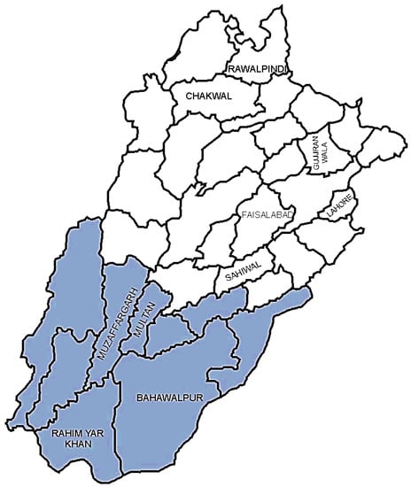 Polished rice of all varieties and brands, intended for human consumption, was randomly purchased in the quantity of 1 kg from different wholesale markets, super markets, and small shops located in ten districts of two different agroecological zones of Punjab (North and South Punjab), Pakistan, during the year 2015. Ninety samples from each region were collected (Figure 2). The average rainfall in South Punjab (SP) and North Punjab (NP) are between 22.65 mm and 66.99 mm, respectively. The average annual temperatures in SP and NP are 26 °C and 24 °C, respectively. The location of SP and NP in coordinates (latitude and longitude) are between 28–30° N, 70–71° E, and 31–33° N, 72–74° E, respectively [74,75].