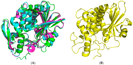 Cartoon 3D-representations of seed Saporin (Sap-SO6) and of its representative homologous RIPs using the program PyMol [12]. (A) The crystal structure at 2.0 Å of Sap-SO6 (PDB code: 1QI7) [9]; (B) Superposition of three representative RIPs Ricin Toxin A (RTA), Ricin A chain, PDB code: J1M (cyan); Momordin, PDB code: 1MOM (magenta); Thrichosanthin, PDB code: 1TCS (green) [13,14,15].