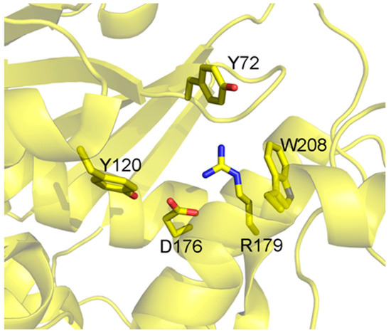 The active site (Figure 2) is conserved between the different isoforms of Saporin, being composed by Tyr72, Tyr120, Glu176, Arg179 and Trp208 (residue numbers referred to are for the Sap-SO6 isoform) [16,17].