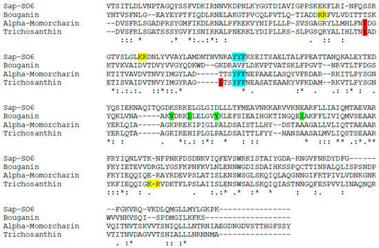 Multiple sequence alignment on RIPs for which there are experimental data on immunogenicity compared with Saporin. In green the four residues identified in Bouganin, in cyan the YFF (or YF) and in yellow and red the sequences identified in Thricosanthin. Alignment has been performed using CLUSTAL O(1.2.4) software (version 1.2.4., Conway Institute UCD Dublin, Ireland, 2017) [65].
