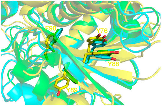 3D structure superposition between Sap-SO6 from Saponaria officinalis (pdb code: 1QI7; in yellow), Ricin chain A from (RTA) Ricinus communis (pdb code: 1J1M, in cyan) and Thricosantin from Trichosantes kirilowii (pdb code: 1TCS; in green) [9,13,15]. Residue numbering is according to Sap-SO6 structure. The Y[Y,F]F motif on the first tyrosine of the motif (Y88) is kept in place by a pi––pi interaction with Y76 on the β4 element. The presence of the latter is strictly correlated to that of the motif. Both Y76 and Y88 belong to 2 adjacent epitopes predicted, in the case of Sap-SO6, to be crucial for MHCII binding by the PropRed program [66] and are not directly involved in enzyme activity.
