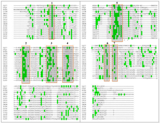 Furthermore, if the prediction for antigenic sites in a larger number of plant RIPs is compared (between those whose 3D structure is known) some common features can additionally be observed. As shown in Figure 7, if the position of the first amino acid of each predicted immunogenic peptide is analyzed, a discrete number of clusters can be observed (numbered from 1 to 7).
