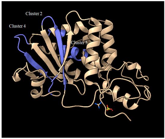 Crystal structure of Sap-SO6 (PDB: 1QI7) highlighting the position of clusters 2, 4, 5 from the analysis of Figure 7.