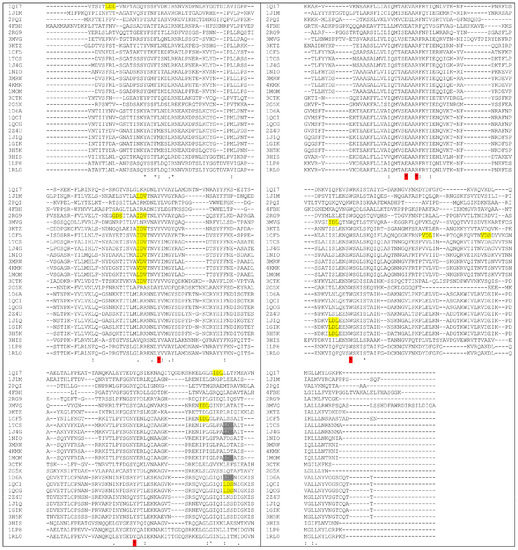 Multiple sequence alignment of Type I RIPs. “X-Asp-Y” motif is shown as highlighted in yellow. Alignment was performed using CLUSTAL O(1.2.4) software [65]. PDB codes correspond to: 1QI7 Saporin SO6 from Saponaria officinalis seeds; 1J1M Ricin A-Chain; 2PQI RIP from maize; 4FBH RIP from barley seeds; 2RG9 Viscum album mistletoe lectin I; 3MVG RIP Iris hollandica; 3KTZ GAP31; 1CF5 β-Momorcharin from Momordica charantia; 1TCS Tricosanthin from Trichosanthes kirilowii; 1J4G Tricosanthin from Trichosanthes kirilowii; 1NIO β-luffin from Luffa cylindrica; 3MRW Ribosome Inactivating protein from Momordica balsamina; 4KMK Ribosome Inactivating protein from Momordica balsamina; 1MOM Momordin from Momordica charantia; 3CTK Bouganin Bougainvillea spectabilis; 2G5X Lychnin from Lychnis chalcedonica; 1D6A Pokeweed antiviral protein (PAP) from Phytolacca americana; 1QCI Pokeweed antiviral protein (PAP) from Phytolacca americana; 1QCG Pokeweed antiviral protein (PAP) from Phytolacca americana; 2Z4U PD-L4 from Phytolacca dioica; 1J1Q Pokeweed Antiviral Protein from Seeds (PAP-S1) from Phytolacca americana; 1GIK Pokeweed antiviral protein (PAP) from seeds of Phytolacca americana; 3H5K PD-L1 from Phytolacca dioica; 3HIS Saporin-L1 from Saponaria officinalis leaves; 1LP8 Dianthin from Dianthus caryophyllus; RIP Dianthin 30 from Dianthus caryophyllus.