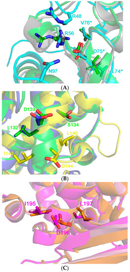 (A) 3D structure superposition between Ricin chain A from Ricinus communis (pdb code: J1M, in cyan), Thricosantin from Trichosantes kirilowii (pdb code: 1TCS; in green) and ribosome inactivating protein from Momordica balsamina (pdb code 4KMK: in gray) [13,15]. The structures have been chosen as representative of Cluster 1 (11 RIPs), where the RIPs are characterized by the conserved [L, I, V] D, V motif at the end of the β5 element. Residue numbering is in accordance to the Ricin A structure. L74, D75 and V76, the residues belonging to the motif are highlighted by an asterisk at the right of the figure. The two residues, i.e., R48 and N97, whose mutants do not elicit the vascular leak syndrome in animal models are not conserved both in the sequence and in structure in the other proteins of the cluster. R56 directly interacts with D75 probably keeping it in place and its position is conserved in most of the protein belonging to Cluster 1. We speculate that this residue is crucial to maintain the architecture of this protein portion, which is adjacent to the active site pocket of the toxin; (B) 3D structure superposition between Thricosanthin from Trichosantes kirilowii (pdb code: 1TCS; in green), Ribosome inactivating protein from Momordica charantia (pdb code 1MOM: in blue) and Sap-SO6 from Saponaria officinalis (pdb code: 1QI7; in yellow) [9,14,15]. The former structures have been chosen as representative of cluster 2 (6 RIPs), whose members are characterized by the L,D,S motif in the αhelix 4. Residue numbering is according to the structure of Thricosanthin. The IDL motif present in the Saporin is peculiar, and it is found one helix-turn before to those of Thricosantin and the RIP from M. charantia; (C) 3D structure superposition between RIP from Phytolacca americana chain A (pdb code: 1J1Q; in orange), RIP from Iris hollandica chain A (pdb code 3MVG: in purple) and RIP from Phytolacca dioica chain A (pdb code: 3H5K; in pink) [80]. The structures belong to Cluster 3 (3 RIPs), whose members are characterized by the I, D, L motif in the αhelix 6. Residue numbering is according to the structure of RIP from Phytolacca americana.