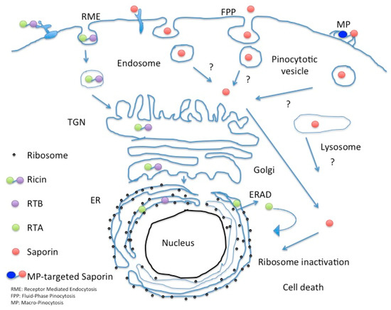 The route followed by Ricin holotoxin in intoxicated cells has been intensively studied, as well as that followed by the bacterial RIP Shiga toxin. Sandvig and colleagues pioneering work first showed in 1992 that the latter exogenous bacterial toxin reached Trans Golgi network (TGN) and subsequently also the ER when A431cells were treated with butyric acid by following a retrograde transport route [81] to be finally retrotranslocated to the cytosol, in order to access target ribosomes and inhibit protein synthesis. Retrograde trafficking routes from early, recycling and late endosomes seem to exist in parallel [82]. This landmark paper established the existence of a transport connection between plasma membrane/endosomes and TGN/Golgi complex/endoplasmic reticulum. Ricin follows a similar Golgi retrograde transport pathway, and it has been demonstrated that this toxin exploits ER chaperones (calnexin/calreticulin) cycling between this compartment and the TGN to reach the ER where A and B chain of the holotoxin dissociate due to the action of Protein Disulfide Isomerase (PDI) [83] and thioredoxin-reductases that reduce the disulfide bond between the A and B chains [5]. Free RTA then mimics a misfolded protein and is therefore targeted for proteasomal degradation [84,85,86] by interacting with EDEM (ER degradation-enhancing α-mannosidase I-like protein 1) and EDEM-2 both of which are key players in redirecting aberrant proteins for ERAD (ER-associated protein degradation). Once in the cytosol the A chain undergoes a rapid refolding and depurinates ribosomal 28S RNA [86]. Type I RIPs are believed to pass through the endo-lysosomal compartment but as shown for Sap-SO6 they likely bypass the Golgi-mediated transport route (see Figure 11) [84,85,86].