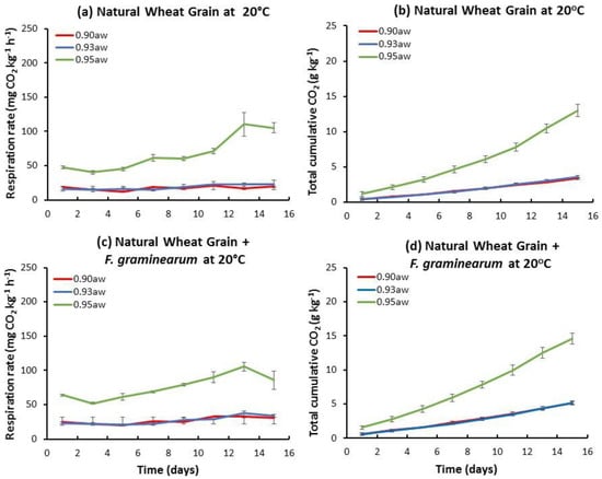 Temporal respiration (a,c) and total accumulation (b,d) of CO2 by naturally contaminated wheat, and that inoculated with F. graminearum stored at 20 °C for up to 15 days at three different water activity levels (aw). Vertical bars represent standard errors of the mean (n = 4).