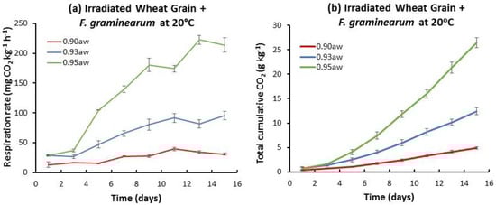 Temporal respiration (a) and total accumulation (b) of CO2 in irradiated wheat inoculated with Fusarium graminearum stored at 20 °C for up to 15 days at three different water activity levels (aw). Vertical bars represent standard errors of the mean (n = 4).