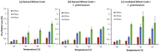 Percentage of Dry Matter Losses (DML) calculated from the total accumulated CO2 after 15 days in natural grain (a) and natural and irradiated wheat with F. graminearum inoculum (b,c) and incubated at different water activities. Vertical bars represent standard deviation of the mean (n = 4).