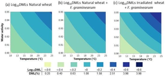 Figure 4 shows that the DMLs increased in the same environmental combination in natural wheat due to F. graminearum colonization. DMLs > 1% occurred with T > 14 °C in natural wheat, however; the same DMLs in the presence of F. graminearum occurred at lower Ts (10 °C/0.95 aw).