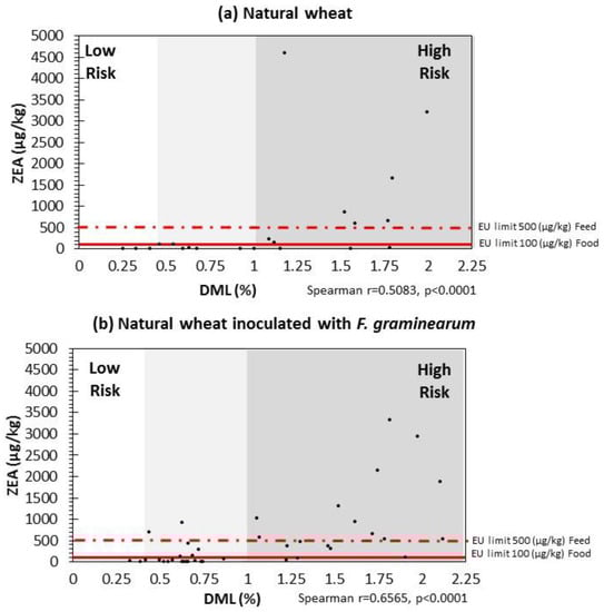 The relationship between DML and ZEN production was examined in the context of the EU legislative limits for this mycotoxin in food and feed. This certainly suggests that where you have naturally contaminated wheat under the conditions examined, a DML of >1% would represent a high risk of ZEN levels above the legislative limits. Where there is a higher inoculum of F. graminearum, this could be even less and between 0.5–0.75% DML. Above this range the risk is significantly increased. Previous studies with DML and DON, and with F. verticillioides and fumonisins in maize suggested that at between 0.8–1% DML, there is an increased risk of contamination levels exceeding the limits set by the EU [].