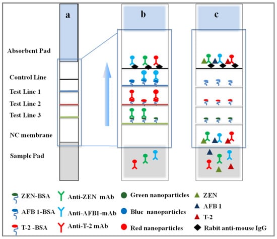 The three antigens of AFB1, T-2 and ZEN were coated on NC membranes successively as three test lines, T1 line, T2 line, and T3 line (Figure 2), and the rabbit anti-mouse IgG was coated as the control line (C line) using a BioDot XYZ platform (Beijing New Point biotechnology company Litd., Beijing, China) at jetting rates of 0.5 μL/cm for T2 and 0.6 μL/cm for T1, T3 and C line. The coated NC membrane was dried for 2 h at 37 °C and sample pad were treated with blocking buffer (0.01 mol/L pH 7.4 PBS + 2% BSA + 2.5% Sucrose + 0.02% NaN3) and dried overnight at 37 °C. Afterwards, the antigen-coated NC membranes were assembled with absorbent pads and sample pads onto the backing card.