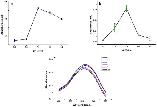 The pH value optimization of: (a) mAb-BNPs; (b) mAb-GNPs; and (c) mAb-AuNPs.