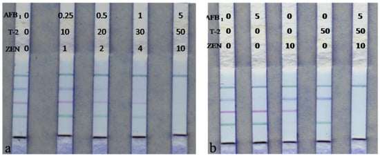 To ensure no interference in the simultaneous detection of multiple mycotoxins, we tested sample mixtures containing all three toxins. The three antibodies presented good specificity for their corresponding antigens and the presence of each of the toxins did not affect the signals for the other toxins (Figure 3b). This result is due to the high specificity of these mAbs. Therefore, these multi-colored strips have high specificity and could be applied to the on-site simultaneous determination of multiple targets.