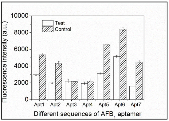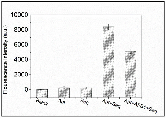 PG reagent is an asymmetric cyanine dye that alone does not fluoresce. However, after binding to dsDNA, the fluorescence of this dye increases by more than 1000-fold [28]. A sensitive and quantitative probe, this commercially available dye allows for the detection of dsDNA levels as low as 25 ng L−1. Utilizing PG’s excellent selectivity and sensitivity for trace dsDNA, a rapid and straightforward label-free aptasensor strategy based on competitive recognition of aptamer by AFB1 and single-stranded DNA (ssDNA) was proposed for small target screening. The sensing mechanism of the proposed method is illustrated in Figure 1. In the control group, Seq hybridized with free AFB1-specific aptamer. After the formation of dsDNA, PG inserts into the minor groove of the dsDNA duplex, resulting in significant enhancement of fluorescence [29]. In the test group, AFB1 bound to aptamer prior to dsDNA formation, leaving only a small about of aptamer remaining for Seq to react with, thus causing a decrease in PG fluorescence intensity compared to the control group. Based on this decrease in fluorescence intensity, AFB1 could be quantified. Importantly, a critical precondition of this methodology is the fluorescent intensity could not be increased by the targets, Seq, or aptamer. This was examined and the results are presented in Figure 2. The blank solution produced negligible fluorescence, while the aptamer and Seq each exhibited very weak fluorescence, likely from the presence of dsDNA duplexes within regions of the ssDNA. As shown in Figure 2, when both aptamer and Seq were present in solution, there was a strong fluorescent signal. Upon addition of the target, this fluorescence dramatically decreased in intensity. This phenomenon was perfectly in line with our hypothesis. In the presence of AFB1, AFB1 bound to the aptamer in advance of the complementary sequence, greatly reducing the chance of dsDNA formation and leading to a decrease in fluorescence. To further validate the proposed method, a mismatch experiment was conducted, and the results are presented in Figure S1. In this experiment, Apt1 recognized AFB1 and was used in the mismatch test. Various concentrations of AFB1 were mixed with Apt1, then identical amounts of Seq1, 2, and 6 (a total of 80 bases) were individually added to the above mixture and the intensity of each well was recorded. Apt1 and Seq1 sequences were completely complementary, while Seq2 and 6 were only partially complementary to Apt1. Fluorescence in the Apt1+Seq1 group decreased gradually as AFB1 content increased, while Apt1+Seq2 and Apt1+Seq6 caused irregular and negligible changes in fluorescence intensity. These results support that the proposed label-free aptasensor strategy is promising for quantitative analysis and effective and suitable for AFB1 detection.