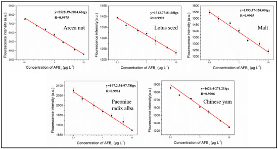 Prior to quantitative analysis of AFB1 in real samples, detection in the presence of matrix interference was examined. A preliminary study was conducted where undiluted primary negative extract in Tris-EDTA (TE) buffer (10 mM Tris-HCl and 1 mM EDTA-2Na, pH 8.0) was mixed with a series of AFB1 standard solutions and fluorescence was measured at 520 nm. As shown in Figure S4, areca nut extract containing various levels of AFB1 displayed a negligible decrease in signal compared to the blank extract, but incurred high background levels. Based on this, various AFB1 levels in primary extract and TE buffer were screened using the proposed method. As observed in Figure S4, in comparison with TE buffer, TCMs extract had high background fluorescence, but this background did not obscure the decrease in signal as AFB1 levels increased. To deal with the complicated matrix, an approach combining dissolution in TE buffer and background correction was adopted.