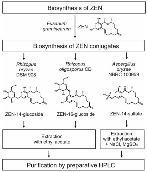 Chart of biosynthesis, isolation and purification of zearalenone (ZEN)-14-glucoside, ZEN-16-glucoside and ZEN-14-sulfate.