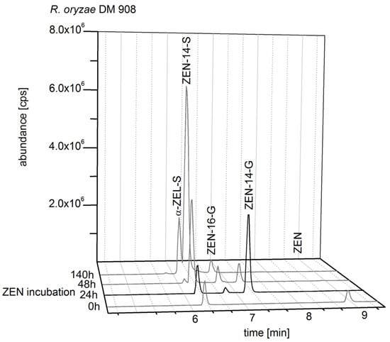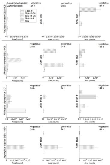 The analyzed A. oryzae strain DSM 1864 formed primarily the ZEN-14-S, and α-ZEL-S to a small extent; for A. oryzae NBRC 100959 the results were the same (Figure 3). Also, for R. microsporus var. chinensis DSM 1834 only the formation of ZEN-14-S and α-ZEL-S was shown. For all aforementioned strains, no glucoside conjugates were formed (Figure S1). The ZEN metabolite formation strongly differs between the closely related strains R. oryzae DSM 906 and DSM 908 depending on the time of harvest. After ZEN addition to the vegetative growth phase with subsequent incubation for 24 h, DSM 908 predominantly formed the ZEN-14-G; DSM 908 media sampled after 144 h contained ZEN-16-G, α-ZEL-S and ZEN-14-S, but no ZEN-14-G. In contrast, DSM 906 showed no considerable metabolite formation after 24 h of ZEN incubation in vegetative phase, but a strong formation of the α-ZEL-S after 144 h. The results of R. oryzae DSM 907 and R. stolonifer DSM 855 resemble to those detected for DSM 908 with only minor differences.