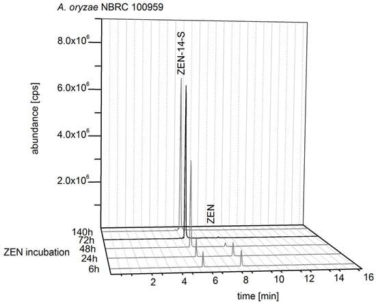 With a focus on conjugation products of unmodified ZEN as basic molecule, a consecutive biosynthesis was developed. Fungal strains with the best results for an exclusive formation of ZEN-14-S, ZEN-14-G, and ZEN-16-G were chosen: A. oryzae NBRC 100959, R. oryzae DSM 908, and R. oligosporus CD, respectively. ZEN biosynthesis and ZEN conjugate biosynthesis were combined by adding ZEN-contaminated rice flour obtained from incubation with F. graminearum F1 into liquid media with subsequent fungal incubation. In Figure 3, the HPLC-MS/MS analysis of the ZEN-14-S formation by A. oryzae NBRC 100959 for five time points of media harvest is shown. Incubation from 6 h to 140 h with ZEN (80 mg/L) showed a decrease of the ZEN content and an increase of ZEN-14-S formation. After 72 h of incubation A. oryzae is in the generative growth phase and an exclusive formation of ZEN-14-S with a negligible residual content of ZEN was observed. ZEN incubation extended to 140 h did not result in an important increase of ZEN-14-S.