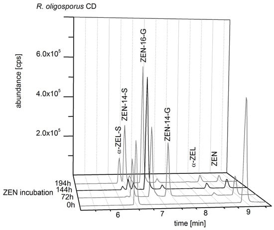 Reconstructed total ion chromatogram (TIC) with mass transitions of zearalenol (ZEL), α-ZEL-sulfate (α-ZEL-S), ZEL-glucoside, zearalenone (ZEN), ZEN-14-sulfate (ZEN-14-S), ZEN-14-glucoside (ZEN-14-G), and ZEN-16-glucoside (ZEN-16-G) analyzed in liquid media of Rhizopus oligosporus CD incubated with ZEN.