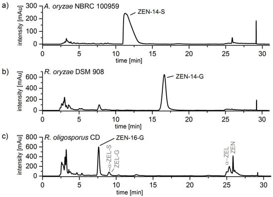 In addition to the LLE, preparative chromatography was conducted as a further cleanup step. In Figure 6 the UV-chromatograms (λ = 265 nm) of the extracted media of A. oryzae NBRC 100959, R. oryzae DSM 908, and R. oligosporus CD are shown. The peaks of ZEN-14-S, ZEN-14-G, and ZEN-16-G with retention times of 11.3 min, 16.5 min, and 7.7 min, respectively, are well separated and after fractionating the purity of each compound was improved. Especially, the preparative purification of ZEN-16-G biosynthesis extract (Figure 6c) led to the successful separation of the byproducts ZEN (RT 25.9 min), α-ZEL (RT 25.4 min), ZEN-14-S, α-ZEL-S (9.0 min), ZEN-14-G, and the possible ZEL glucoside (9.0 min) from the target compound.