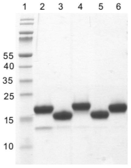 The pMECS plasmids containing these Nb genes were purified from TG1 cells and transformed in E. coli WK6 cells. The nanobodies in pMECS expressed in WK6 cells contain a C-terminal haemagglutinin (HA) and a hexahistidine (His6) tag; and were purified from the periplasmic extracts by IMAC and SEC (Figure 1). One single band (except for Nb29) is seen upon Coomassie blue staining of the SDS-PAGE of these nanobodies. The apparent MW of each Nb is close to 15,000–16,000 as expected (Supplementary Materials, Table S1) and the same bands were also revealed after western blot using anti-His antibodies as probe (data not shown).