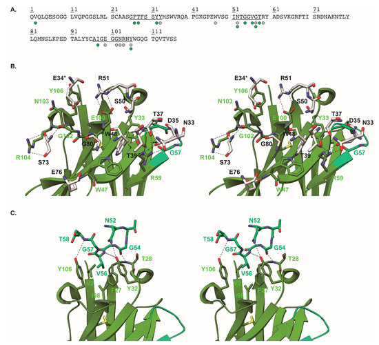 Detailed view of Nb113–rStx2aB and Nb113–Nb113 interactions. (A) Amino acid sequence of Nb113 (numbered sequentially). The CDRs are underlined. The residues marked by the green and grey circles are involved in Nb113 and rStx2aB binding, respectively. (B) Stereo view of Nb113–rStx2aB interactions. Nb113 is depicted in cartoon representation. For reasons of clarity, only the rStx2aB residues forming part of the epitope of Nb113 are shown and colored in light grey. All interacting residues are shown in a stick representation and are indicated by the colored labels (green and black for Nb113 and rStx2aB residues, respectively). The dashed lines indicate hydrogen bonds or salt bridges (also see Supplementary Materials, Table S3). Residues indicated by an asterisk originate from a neighboring Stx2a B subunit. (C) Stereo view of Nb113–Nb113 interactions. The first Nb113 copy is colored as in (B). For reasons of clarity only the CDR2 residues of the neighboring Nb113 copy are shown and colored in spring green. All interacting residues are shown in a stick representation and are indicated by the colored labels (green and spring green, respectively). The dashed lines indicate hydrogen bonds or salt bridges (also see Supplementary Materials, Table S4).