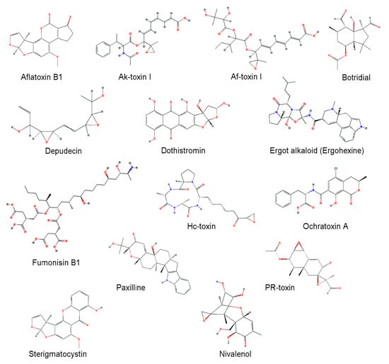 Chemical structures of mycotoxins. Chemical structures were obtained from PubChem (https://pubchem.ncbi.clm.cih.gov) [117].