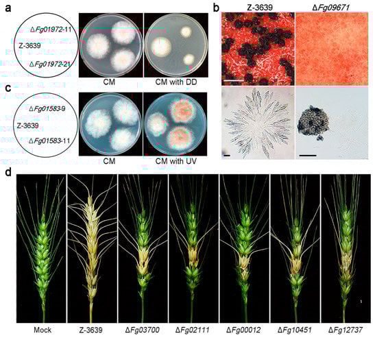Phenotypic analyses of CYP deletion mutants of F. graminearum. (a) Altered xenobiotic stress response of wild type (Z-3639) and one CYP deletion mutant. DD, 1-dodecanol; (b) Development of perithecia (upper panel) and formation of asci rosettes (lower panel); A CYP gene deletion strain (right panel) showed defects in perithecia and ascospore formation whereas the parent strain (left panel) displayed normal perithecia and ascospores. Scale bar = 500 μm (upper), 20 μm (lower left), and 200 μm (lower right); (c) Altered ultra-violet (UV) stress response of wild type and CYP mutant strain; (d) Virulence of wild-type and CYP deletion strains on wheat heads. Five mutants showed reduced virulence compared to the wild-type strain (Z-3639). These data have been reproduced from [21] with slight modifications, Copyright 2013, John Wiley & Sons.