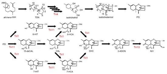 Trichothecenes are a large family of sesquiterpenoid secondary metabolites mainly produced by Fusarium spp. [165]. They are potent inhibitors of protein translation in eukaryotes via ribosomal binding [166]. DON and NIV are not only phytotoxins that contribute to the virulence of F. graminearum, but also mycotoxins that cause moldy-grain toxicosis in animals. In experimental animals, acute high-dose exposure induces a radiomimetic effect, with symptoms such as diarrhea, vomiting, leukocytosis, and gastrointestinal hemorrhage. At extremely high doses, these effects can cause circulatory shock, reduced cardiac output, and ultimately result in death [167]. NIV is significantly more toxic than DON [168]. Four CYPs, Tri1, Tri4, Tri11, and Tri13, are involved in biosynthesis of trichothecenes (Figure 4). Among the four CYPs in the trichothecene biosynthetic gene cluster, Tri13, 3-acetyltrichothecene C-4 hydroxylase, is responsible for hydroxylation of trichothecenes at C-4 [169]; the gene is therefore a determinant of the DON- and NIV-producing chemotypes in F. graminearum [170]. TRI4 encodes a multifunctional oxygenase that is responsible for the conversion of trichodiene to isotrichotriol. TRI4 mutants do not produce trichothecenes and highly accumulate trichodiene [70,171]. TRI1 and TRI11 encode 3-acetyltrichothecen C-8 hydroxylase and isotrichodermin C-15 hydroxylase, respectively [71].