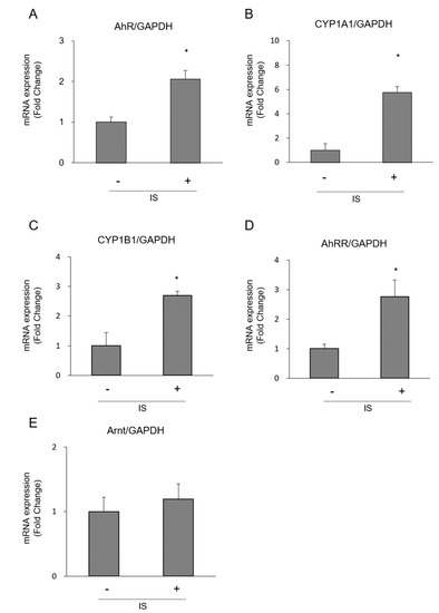 Activation of AhR pathway in THP-1 macrophages exposed to IS. (A) AhR; (B) CYP1A1; (C) CYP1B1; (D) AhRR; and (E) Arnt expression were determined by real-time PCR. Data represent the mean ± SD of three experiments. * p < 0.05 vs. without IS.