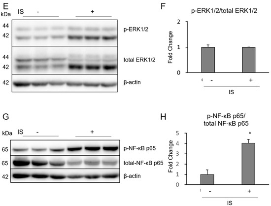 Phosphorylation of MAPK/NF-κB in THP-1 macrophages exposed to IS. Effect of IS on (A,B) p38; (C,D) JNK; (E,F) ERK1/2; and (G,H) NF-κB p65 phosphorylation were determined by Western blotting. Data represent the mean ± SD of three experiments. * p < 0.05 vs. without IS.