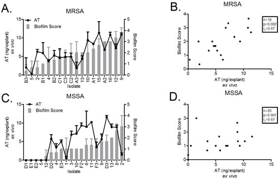 All 18 (100%) MRSA isolates and 16 (80%) of 20 MSSA isolates produced some biofilm (Figure 1A,C). The remaining 4 MSSA isolates (D1, E1, E2 and 5) that did not form a biofilm also did not produce detectable AT. AT production and biofilm formation were strongly correlated for both MRSA (rs = 0.67, p = 0.002) and MSSA (rs = 0.67, p = 0.001) isolates (Figure 1B,D). The relationship between biofilm formation and AT production was largely linear except for two isolates. MRSA isolate 2 produced AT (mean 6.28 ng/explant) but minimal biofilm (mean biofilm score of 0.67). MSSA isolate 2 produced a low amount of AT (mean 1.48 ng/explant) but formed a biofilm (mean biofilm score of 3).