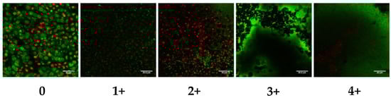 Scoring system for S. aureus biofilm images. Biofilm formation by S. aureus (SA) isolates on biological substrate (porcine vaginal mucosa (PVM) explants) at 72 h was evaluated by LIVE/DEAD® staining (SYTO® 9 [green = live] plus propidium iodide [red = dead]), which does not discriminate eukaryotic from prokaryotic cells, and confocal laser scanning microscopy. Ex vivo biofilms were scored on a 5-point scale. 0: no biofilm, few if any attached bacteria, live epithelial cells observed throughout image (large, green, punctate staining) with some interspersed dead cells (red punctate staining). 1+: biofilm covers >0–25% of surface area; live, adherent bacteria observed as small, bright green punctate staining interspersed among live (green) and dead (red) epithelial cells. 2+: biofilm covers 26–50% of surface area; microcolonies observed as clusters of live bacteria in the lower right quadrant, more mature biofilm observed in the upper right quadrant (continuous green staining), many dead (red) epithelial cells apparent, some of which have sloughed off (black areas). 3+: biofilm covers 51–75% of surface area; large, cloudlike, live (green) biofilm observed and no epithelium evident. 4+: biofilm covers 76–100% of surface area; thick, dense biofilm (large proportion of image covered in green, small red punctate staining in the middle to lower left quadrant are dead bacteria). Isolates (n = 3) individually scored by two blinded observers. This was done twice for a total of 6 observations per isolate. Scale bar within each image is equal to 30 μm.