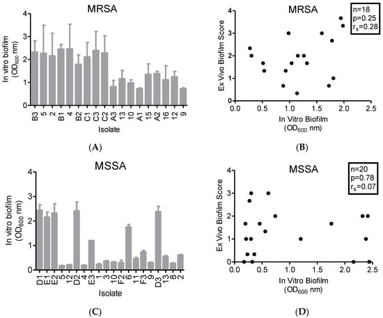All 18 MRSA isolates were strong or very strong biofilm formers (OD > 0.24) at 24 h in glucose-supplemented broth in polystyrene wells. However, the extent of biofilm production varied markedly, where four isolates (22%) produced biofilms with OD > 0.24 to <1.0, and the remaining 14 isolates (78%) produced biofilms with OD > 1.0 (Figure 3A). In contrast, of the 20 MSSA isolates four (20%) [7,10,20,21] were weak biofilm formers (OD > 0.12 to <0.24, Figure 3C). The remaining 16 MSSA isolates were strong or very strong biofilm formers (OD > 0.24), including seven (35% of 20) that produced very strong biofilms (OD > 1.0). Correlation analysis of in vitro versus ex vivo biofilm production showed a weak correlation for MRSA isolates (rs = 0.28, p = 0.25, Figure 3B) and a very weak correlation for MSSA isolates (rs = 0.07, p = 0.78, Figure 3D). Notably, MSSA strains that produced no detectable AT and did not form a biofilm on the ex vivo mucosa (strains D1, E1, and E2) were very strong biofilm formers in vitro.