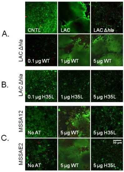- Anderson, M.J.; Lin, Y.-C.; Gillman, A.N.; Parks, P.J.; Schlievert, P.M.; Peterson, M. Alpha-Toxin Promotes Mucosal Biofilm Formation by Staphylococcus aureus. Front. Cell. Infect. Microbiol. 2012, 2, 64. [Google Scholar] [CrossRef] [PubMed]