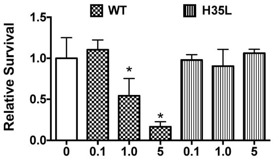 Toxicity of wild-type and H35L mutant alpha-toxins. Purified wild-type (WT) alpha-toxin (AT) or AT H35L mutant was added to porcine vaginal mucosa explants at varying doses and viability was determined by an MTT-based assay. WT AT was cytotoxic at higher concentrations (1 and 5 μg/explant), while the AT H35L mutant (non-pore forming) was non-toxic. Data (n = 3) are represented as mean ± SD; * denotes significance from non-AT treated control explants; p < 0.05 as determined by one-way analysis of variance followed by Dunnett’s multiple comparisons post-test.