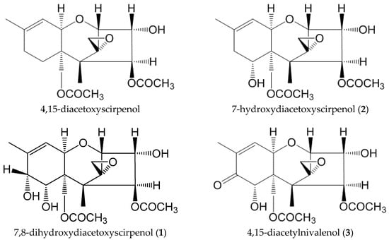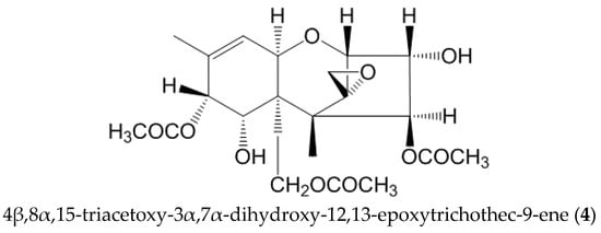- Grove, J.F. Phytotoxic compounds produced by Fusarium equiseti. Part VI. 4β,8α, 15-Triacetoxy-12,13-epoxytrichothec-9-ene-3α,7α-diol. J. Chem. Soc. C Org. 1970, 2, 378–379. [Google Scholar] [CrossRef]