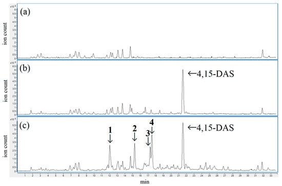 Extracts from the culture broth of Fusarium sp. were subjected to Q-TOF LC/MS. Total ion chromatograms of liquid medium with no fungal growth (a) and the culture broth of fungi which produced 4,15-DAS (b,c).